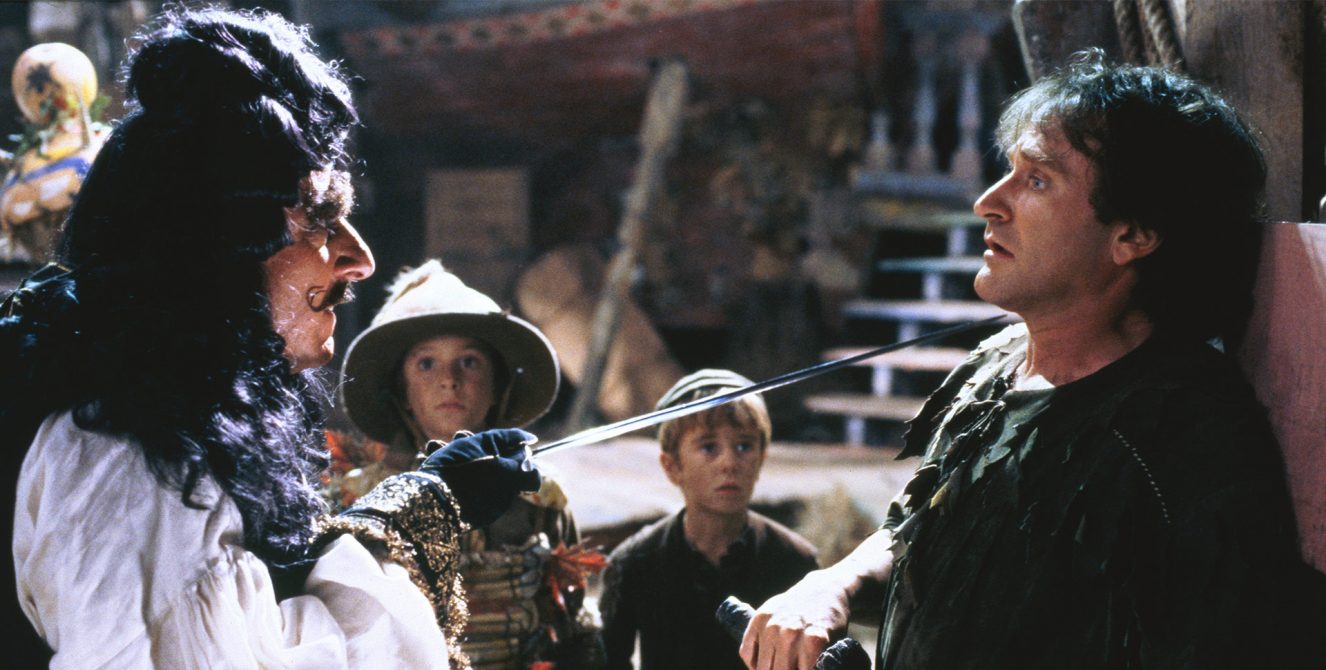 In Hook, Spielberg filters J. M. Barrie’s Peter Pan through a distinctly 1990s sensibility. Peter Pan has become Peter Banning (Robin Williams), a 40-year-old mergers and acquisitions lawyer with a permanent scowl on his face and a cellular phone in his belt. Banning has lost any memory of being Peter Pan, and he is also in danger of losing his wife Moira (Caroline Goodall) and two children, Jack (Charlie Korsmo) and Maggie (Amber Scott). Peter and his family travel to London to visit Granny Wendy (Maggie Smith) who recalls Peter’s lost youth and asks him, “Peter, dear, don’t you know who you are?” With Peter’s children asleep in the same bedroom where the original Peter Pan story began, there is a blinding flash. Peter comes into the room to discover a note from Captain Hook (Dustin Hoffman), informing Peter that he has kidnapped his children. Granny Wendy now tells him who he really is and encourages him to re-discover his happy thoughts, transform himself into the Peter Pan of the past, and go rescue his children. With the encouragement of Tinkerbell (Julia Roberts), Peter recalls the birth of his son and once again takes wing. Then it’s off to Never Land to rescue his kids.